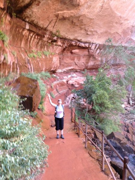 Auf dem Weg zu den Emerald Pools läuft man unter Wasserfällen hindurch. Leider sind diese zur Zeit aber etwas trocken. Trotzdem wurde man noch nass, aber bei 32 Grad ganz angenehm.